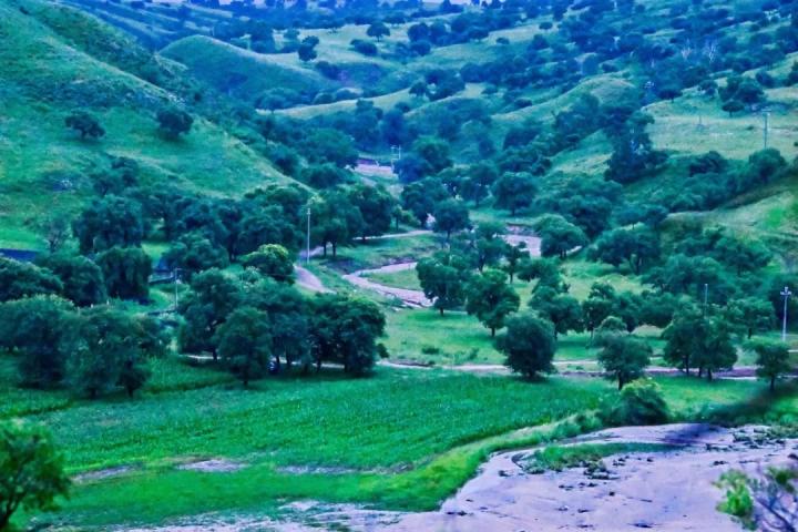 登頂“牧云天凈”觀景臺(tái),但見夏風(fēng)拂過2600米海拔草甸,綠海翻涌接天,野花星落成毯,牛羊如珍珠灑落碧玉盤;云影掠過疏林草原,在起伏的草浪上投下流動(dòng)水墨。獨(dú)特地貌孕育“一日閱盡三荒”奇觀——晨穿灼熱沙漠,午行蒼茫戈壁,暮歸幽靜疏林,轉(zhuǎn)角邂逅沙河淺灘踏水清涼。